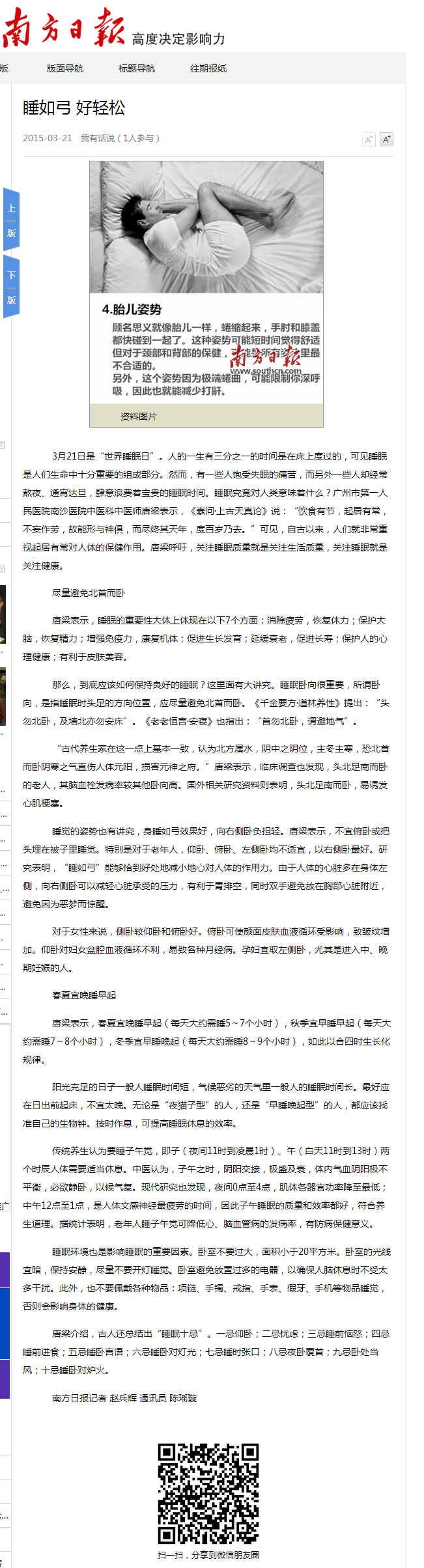 《南方日报》:睡如弓 好轻松 2015年3月21日17版
