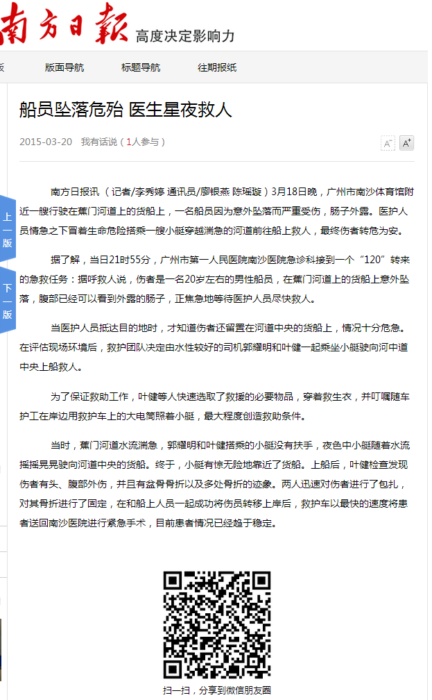 《南方日报》:船员坠落危殆 医生星夜救人 2015年3月20日AII07版
