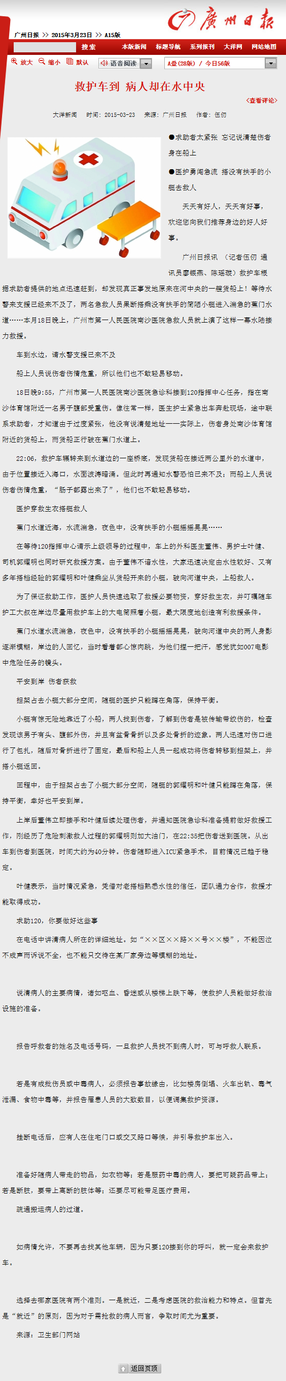 《广州日报》:救护车到 病人却在水中央 2015年3月23日A15版