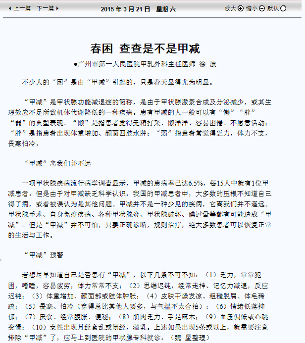 《健康报》:春困 查查是不是甲减 2015年3月21日A04版