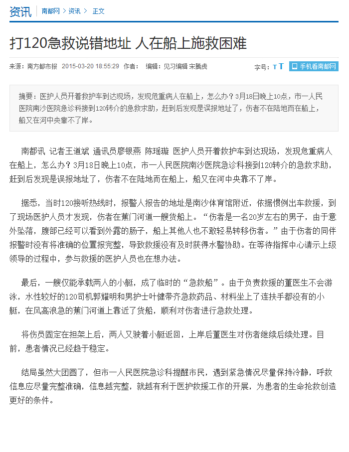 《南方都市报》:打120急救说错地址 人在船上施救困难 2015年3月20日