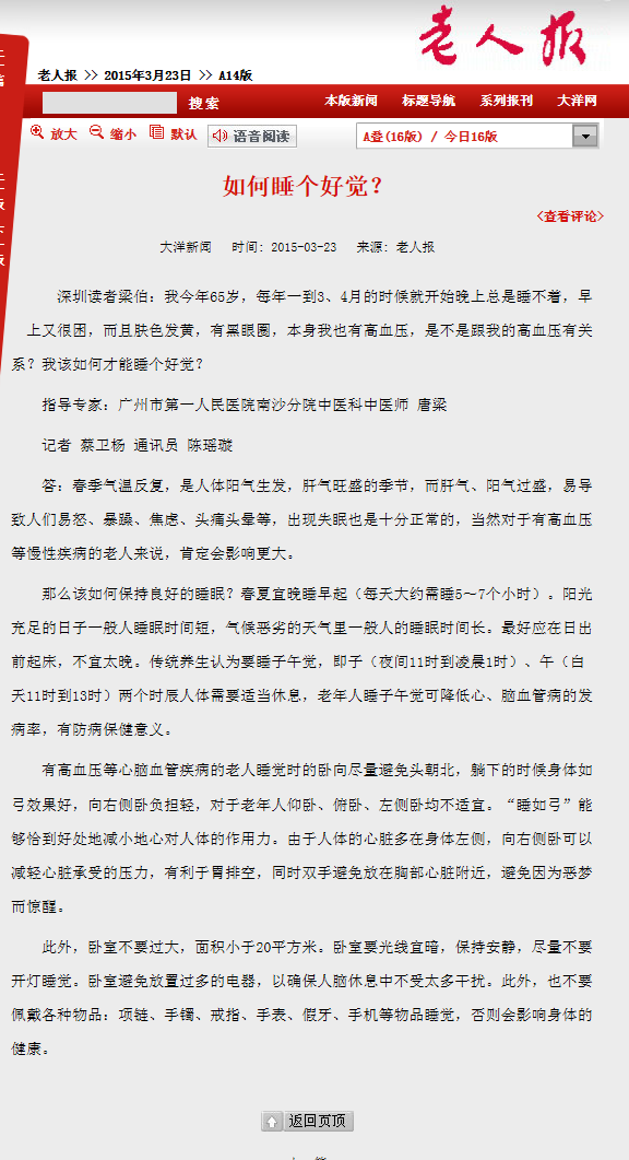 《老人报》:如何睡个好觉? 2015年3月23日A14版
