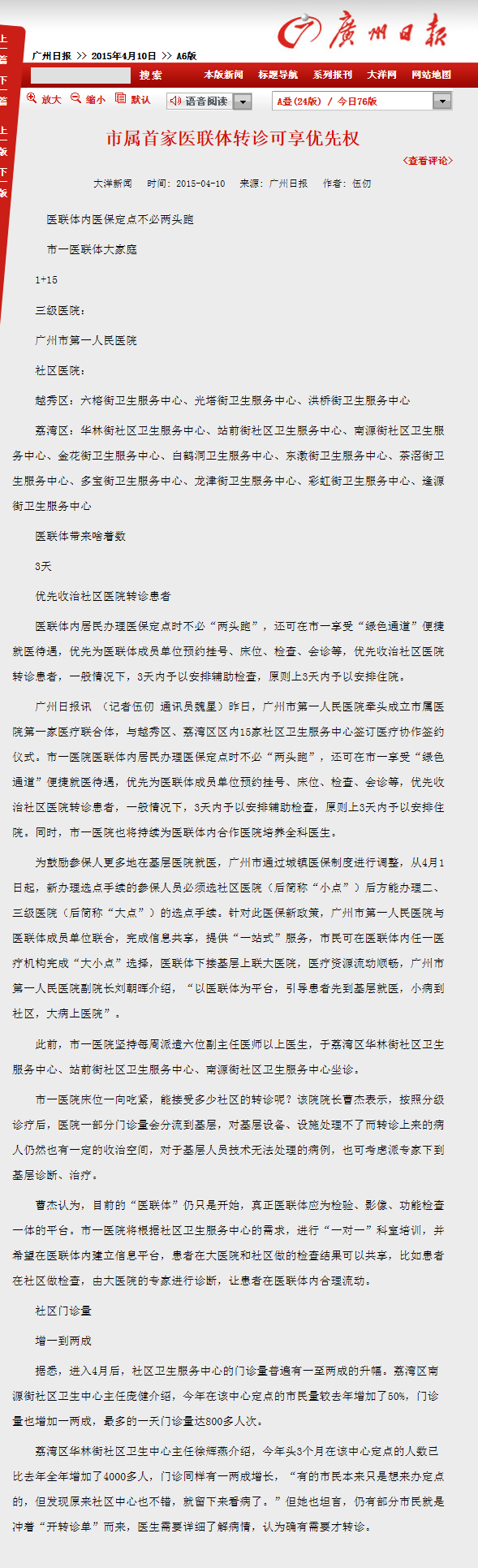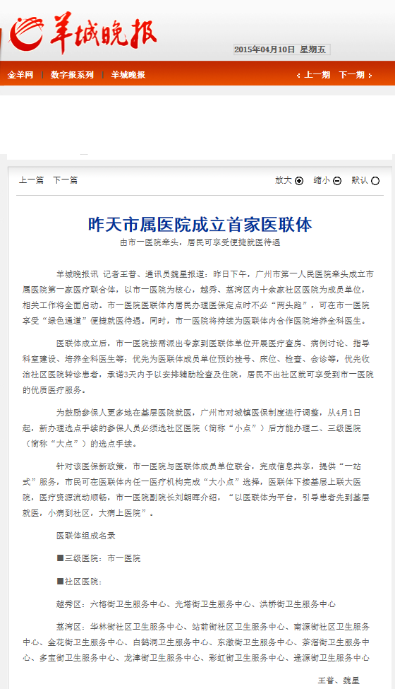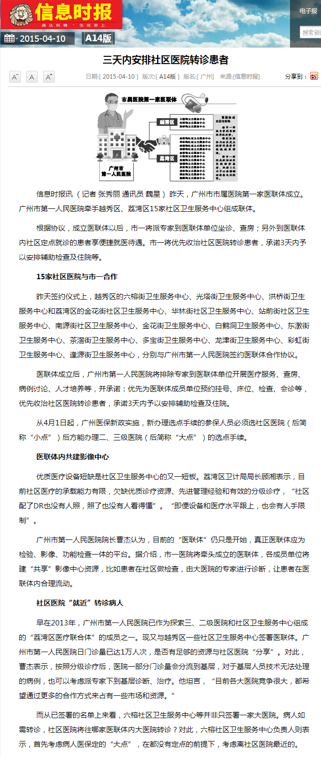 《广州日报》:市属首家医联体转诊可享优先权 2015年4月10日A06版