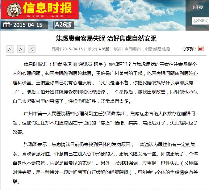 《信息时报》:焦虑患者容易失眠 治好焦虑自然安眠 2015年4月15日A26版
