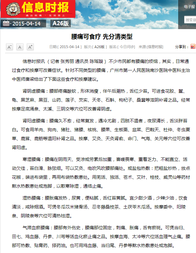 《信息时报》:腰痛可食疗 先分清类型 2015年4月14日A26版