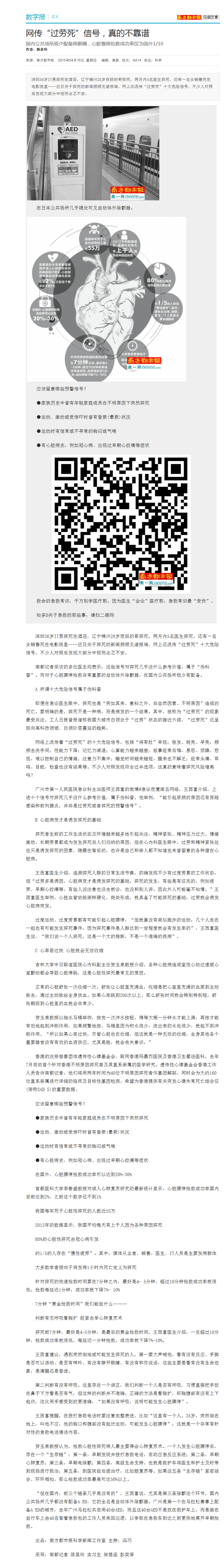 《南方都市报》:网传“过劳死”信号 真的不靠谱 2015年4月16日A14版