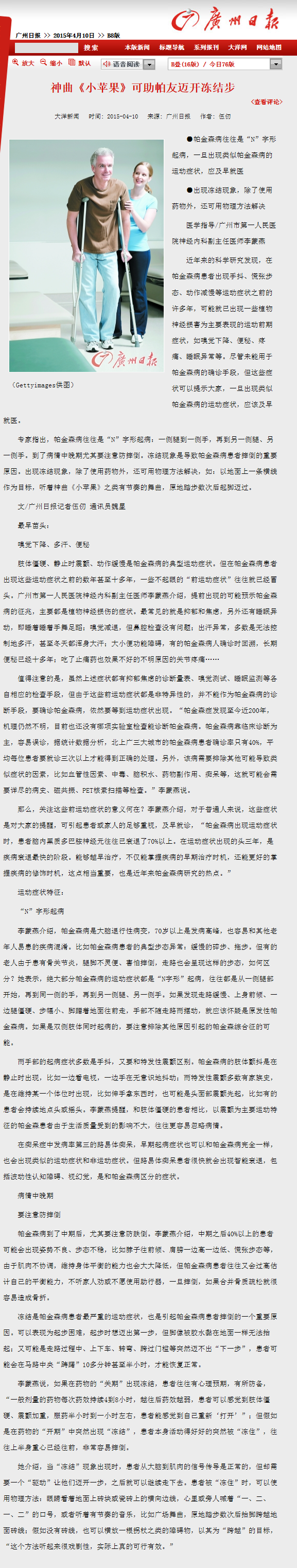 《广州日报》:神曲《小苹果》可助帕友迈开冻结步 2015年4月10日B08版