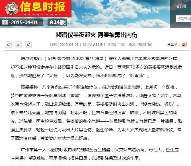 《信息时报》:频谱仪半夜起火 阿婆被熏出内伤 2015年4月1日A14版
