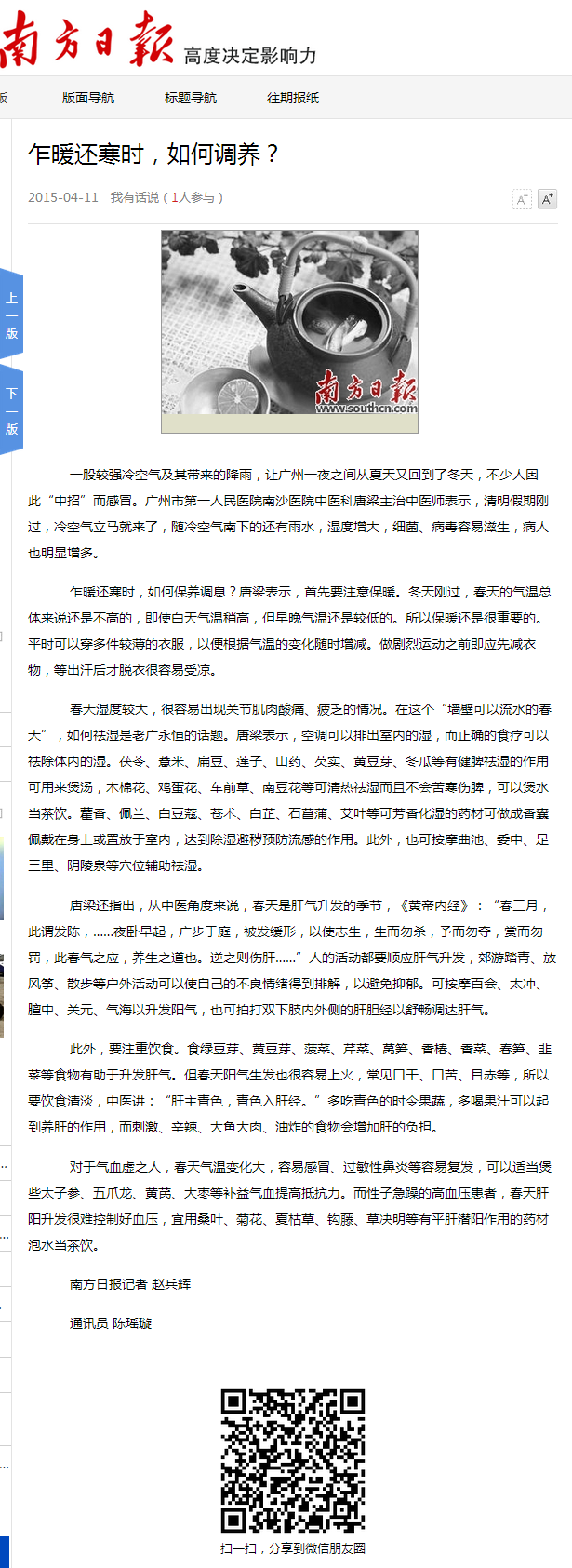 《南方日报》:乍暖还寒时,如何调养? 2015年4月11日17版