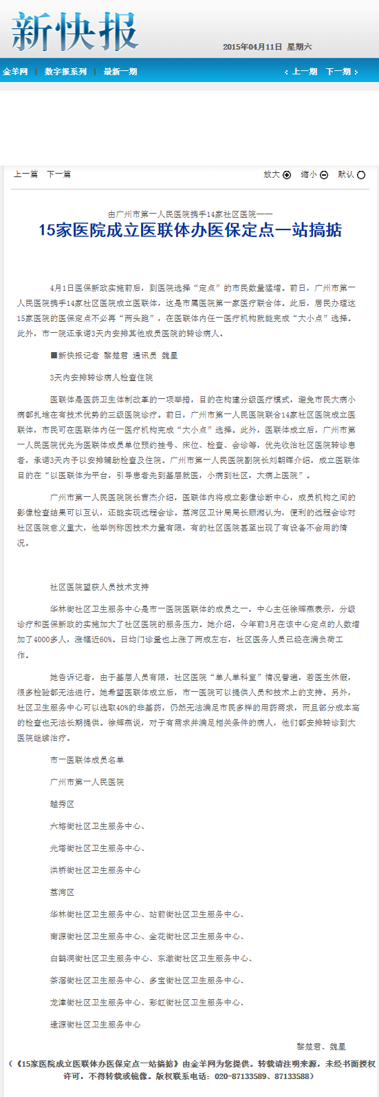《新快报》:15家医院成立医联体办医保定点一站搞掂 2015年4月11日A06版