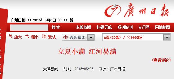 《广州日报》:立夏小满 江河易满 2015年5月6日A13版