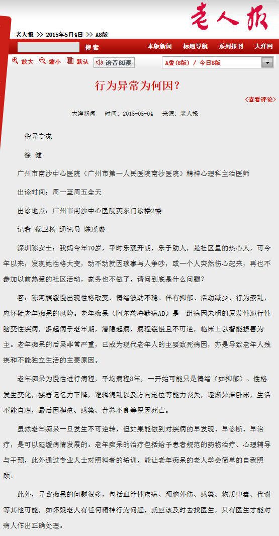 《老人报》:行为异常为何因? 2015年5月4日A08版