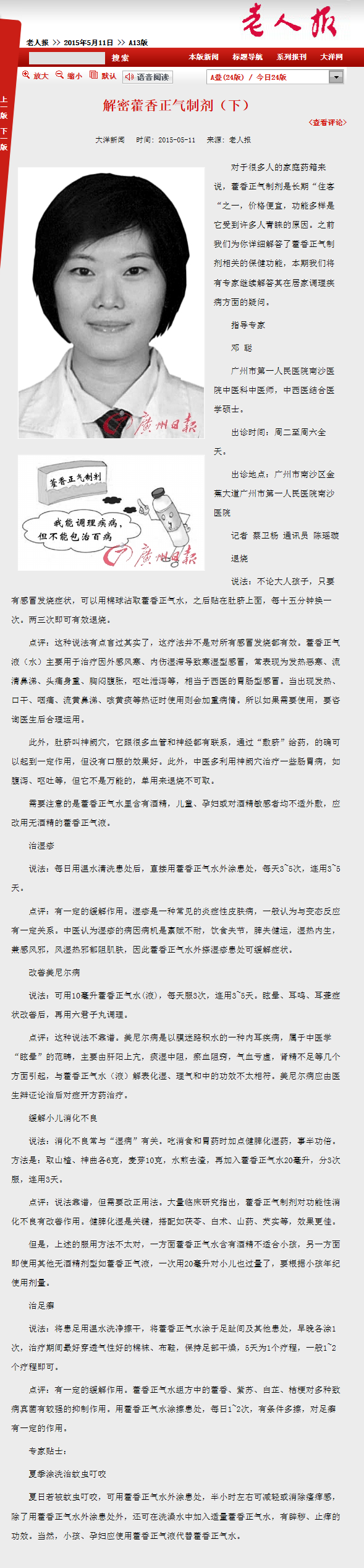 《老人报》:解密藿香正气制剂(下) 2015年5月11日A13版