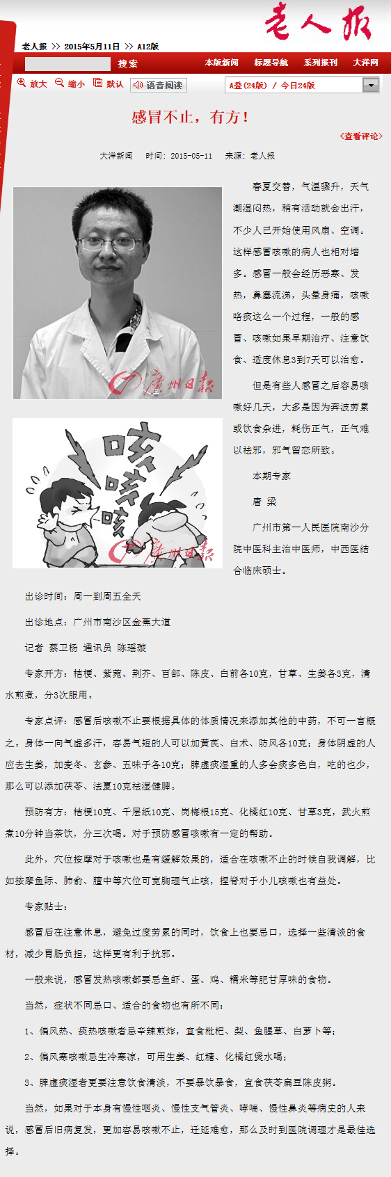 《老人报》:感冒不止,有方! 2015年5月11日A11版