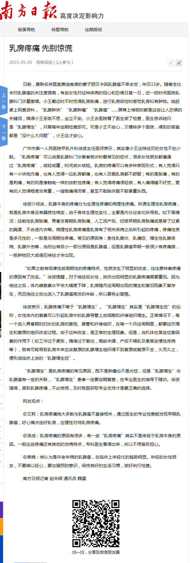 《南方日报》:乳房疼痛 先别惊慌 2015年5月5日B02版