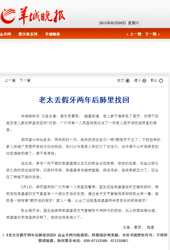 《羊城晚报》:老太丢假牙两年后肺里找回 2015年5月9日A05版