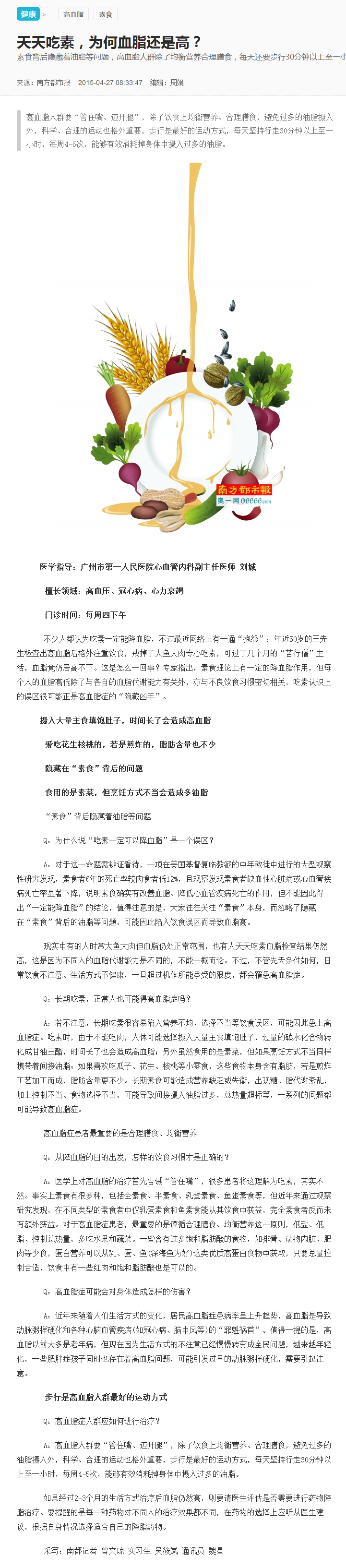 《南方都市报》:天天吃素,为何血脂还是高? 2015年4月27日AII08版