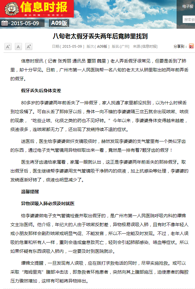 《信息时报》:八旬老太假牙丢失两年后竟肺里找到 2015年5月9日A09版