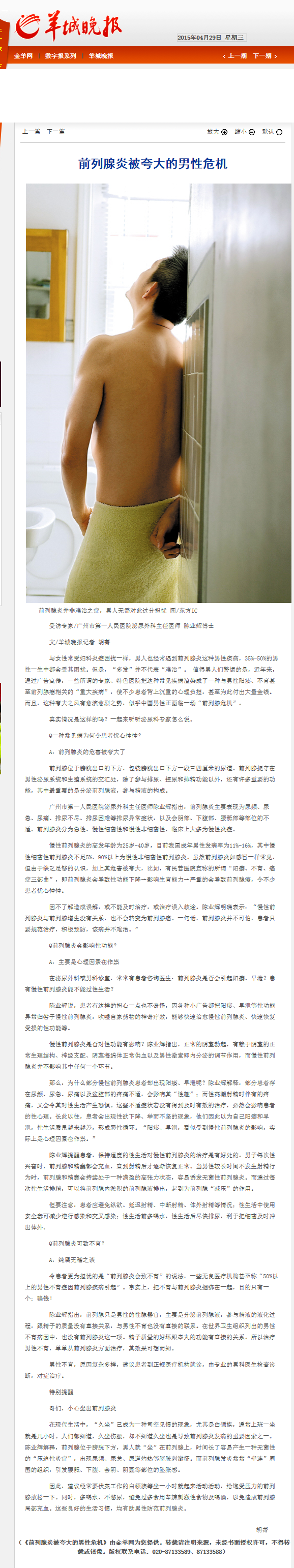 《羊城晚报》:前列腺炎被夸大的男性危机 2015年4月29日B07版