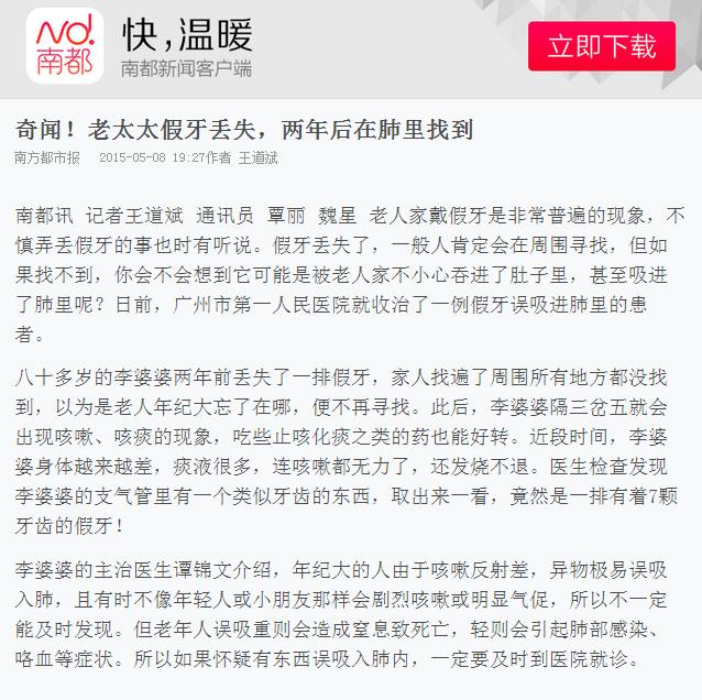 《南方都市报》:奇闻!老太太假牙丢失,两年后在肺里找到 2015年5月8日