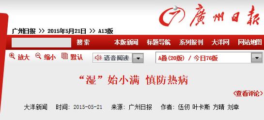 《广州日报》:“湿”始小满 慎防热病 2015年5月21日A13版