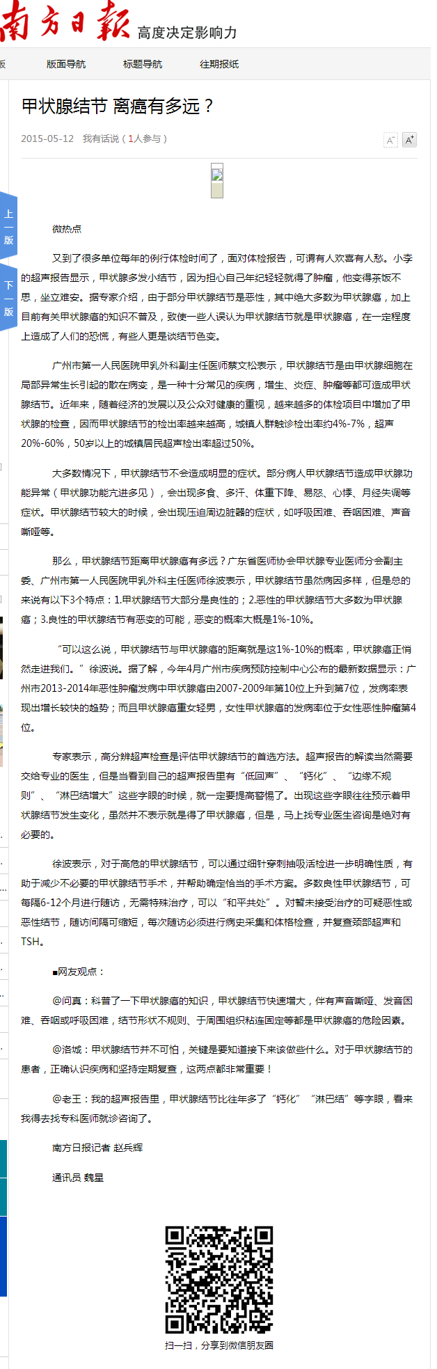 《南方日报》:甲状腺结节 离癌有多远? 2015年5月12日B02版