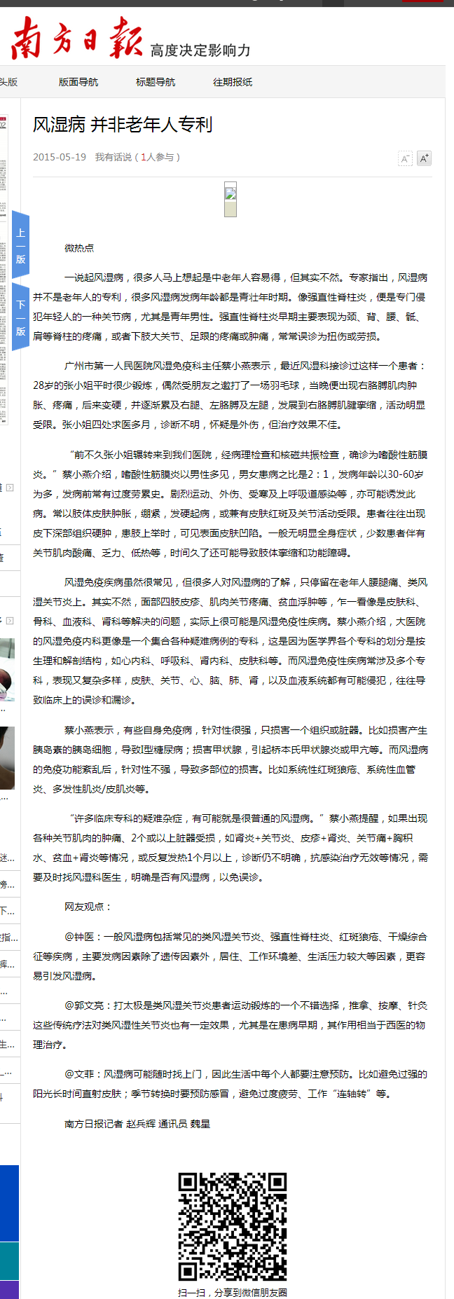 《南方日报》:风湿病 并非老年人专利 2015年5月19日B02版
