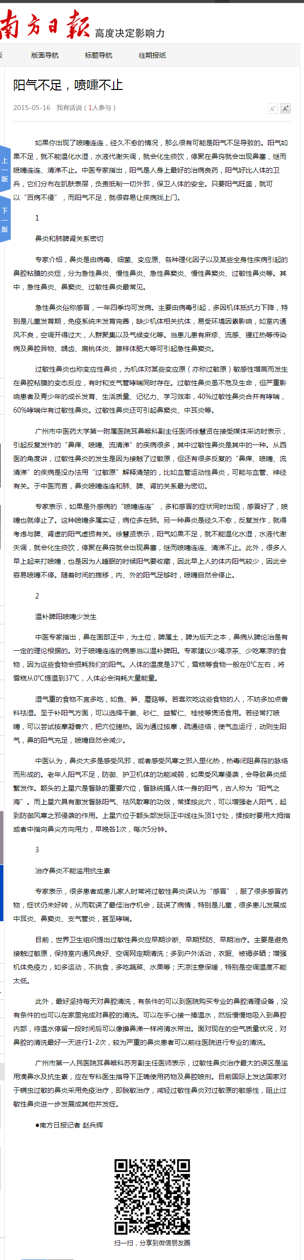 《南方日报》:阳气不足,喷嚏不止 2015年5月16日A17版