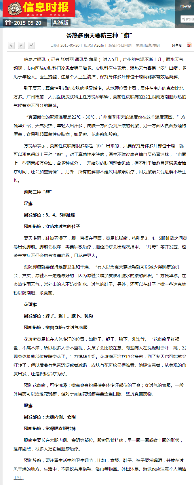 《信息时报》:炎热多雨天要防三种“癣” 2015年5月20日A26版