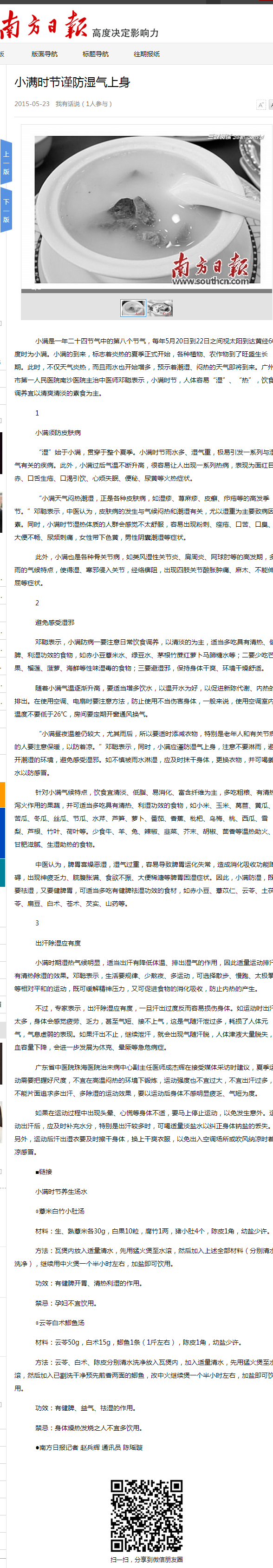 《南方日报》:小满时节谨防湿气上身 2015年5月23日17版