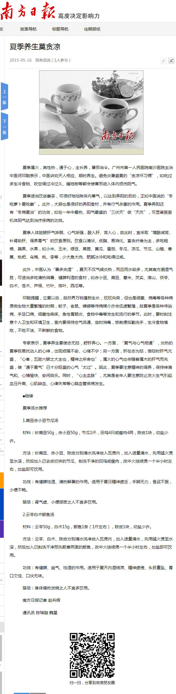 《南方日报》:夏季养生莫贪凉 2015年5月16日A17版