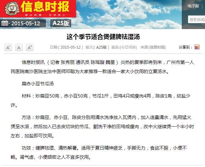 《信息时报》:这个季节适合煲健脾祛湿汤 2015年5月12日A25版