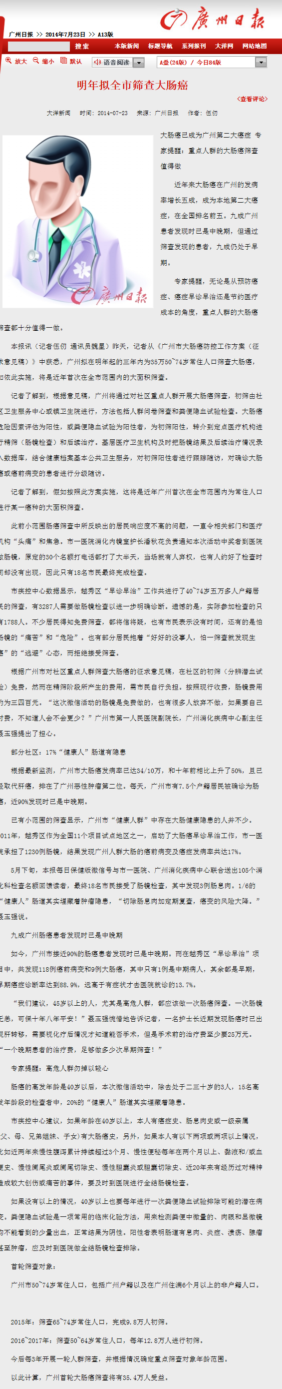 《广州日报》:明年拟全市筛查大肠癌 2014年7月23日A13版