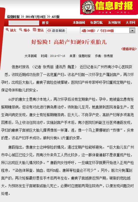 《信息时报》:好惊险!高龄产妇诞9斤重胎儿 2014年7月16日A27版