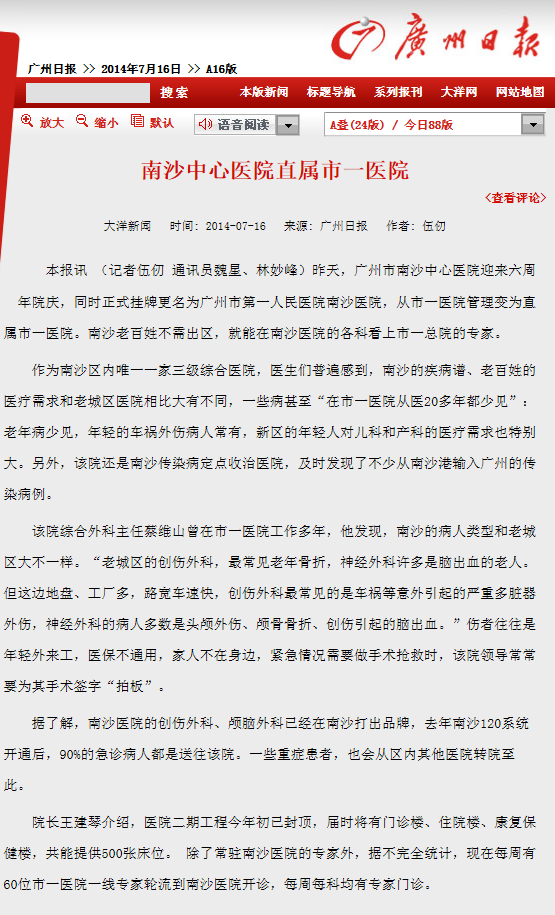 《广州日报》:南沙中心医院直属市一医院 2014年7月16日A16版