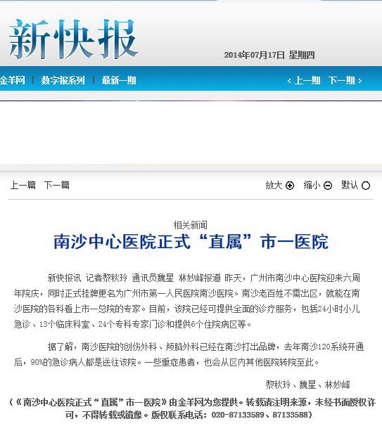 《新快报》:南沙中心医院正式“直属”市一医院 2014年7月17日A19版