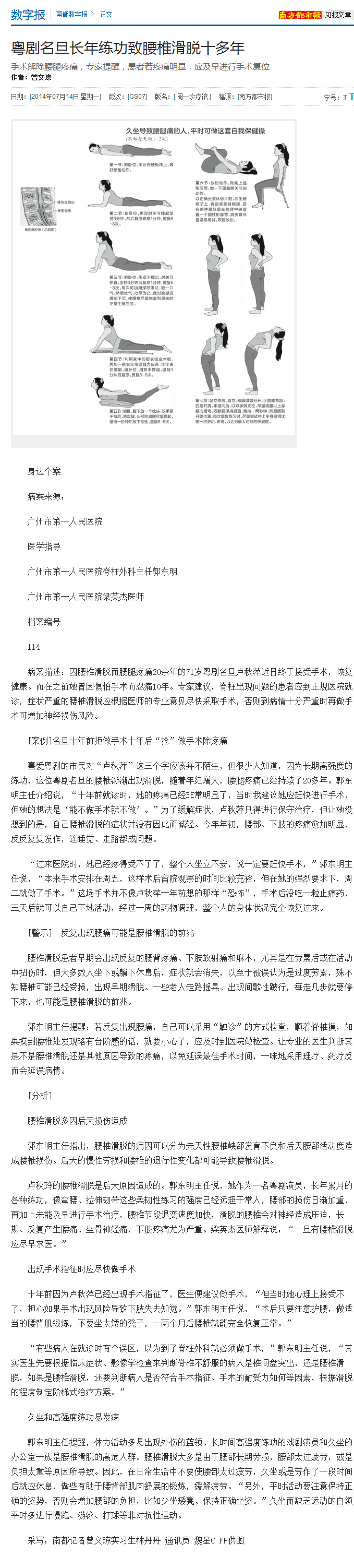 《南方都市报》:粤剧名旦常年练功致腰椎滑脱十多年 2014年7月14日GS07版