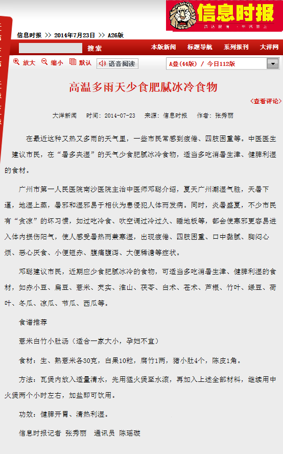 《信息时报》:高温多雨天少食肥腻冰冷食物 2014年7月23日A26版