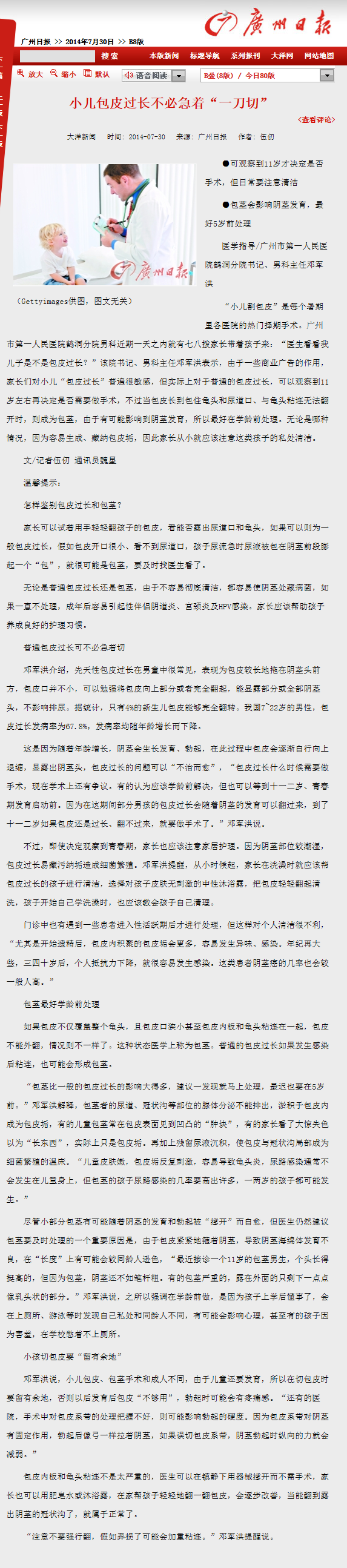 《广州日报》:小儿包皮过长不必急着“一刀切” 2014年7月30日B08版
