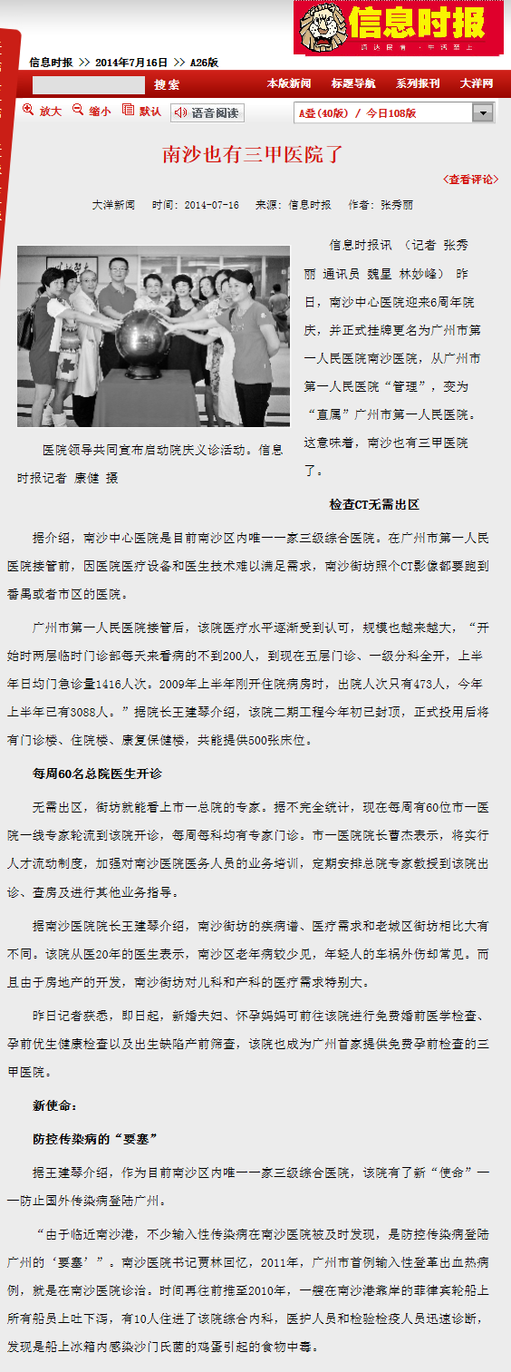 《信息时报》:南沙也有三甲医院 2014年7月16日A26版