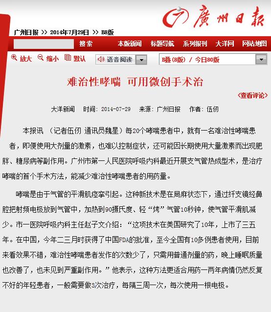 《广州日报》:难治性哮喘 可用微创手术治 2014年7月9日B08版