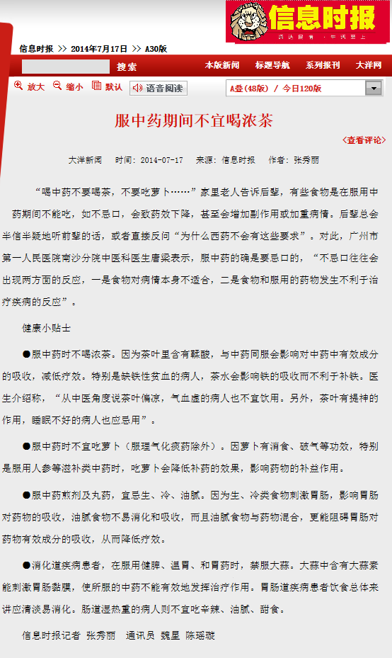 《信息时报》:服中药期间不宜喝浓茶 2014年7月17日A30版
