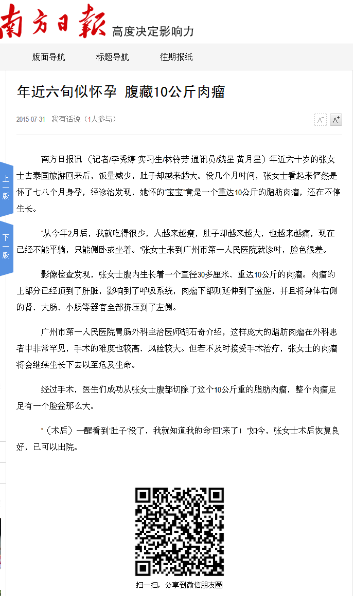 《南方日报》:年近六旬似怀孕 腹藏10公斤肉瘤 2015年7月31日AⅡ08版