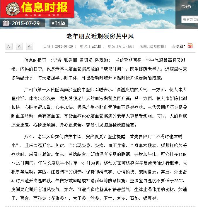 《信息时报》:老年朋友近期须防热中风 2015年7月29日A24版