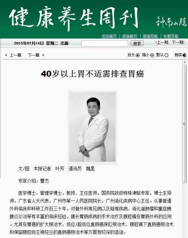 《健康养生周刊》:40岁以上胃不适需排查胃癌 2015年7月14日A02版