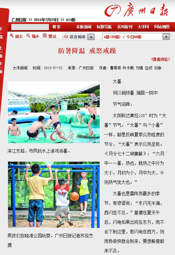 《广州日报》:防暑降温 戒怒戒躁 2015年7月23日A14版