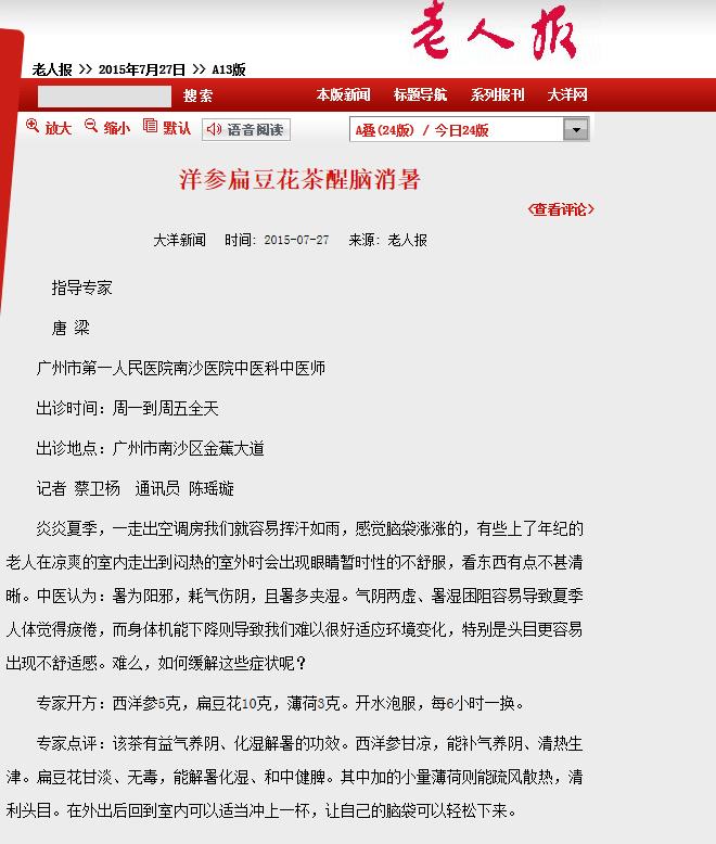 《老人报》:洋参扁豆花茶醒脑消暑 2015年7月27日A13版
