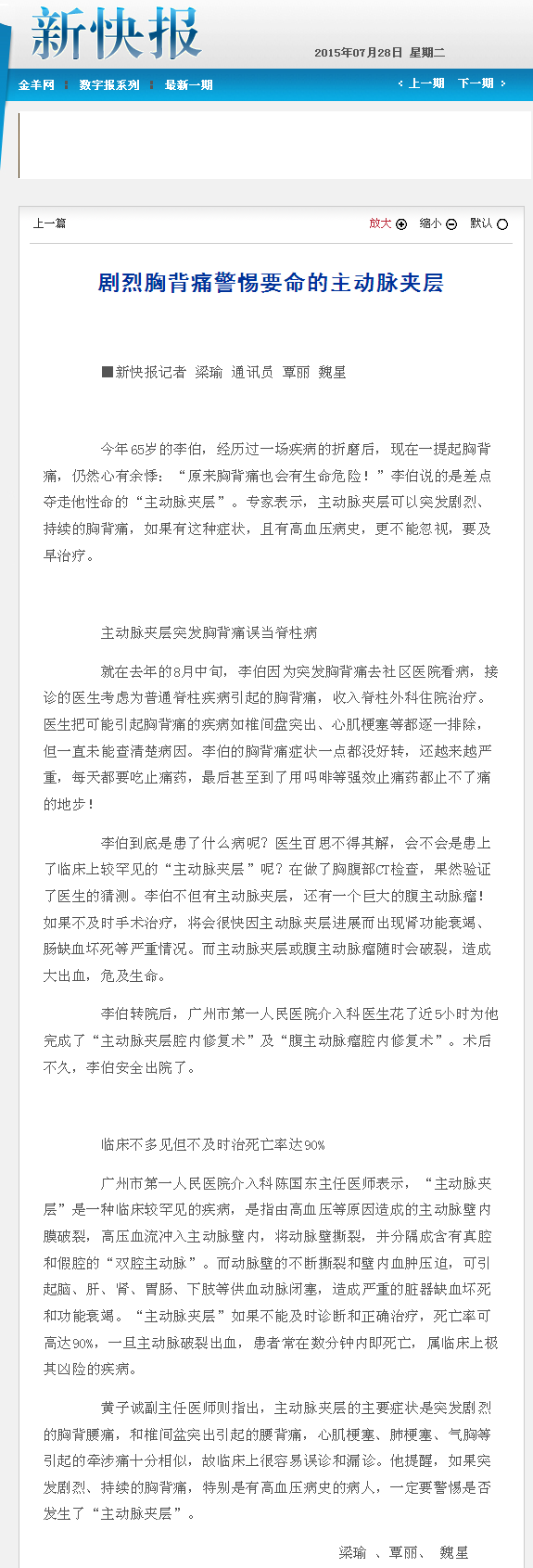 《新快报》:剧烈胸背痛警惕要命的主动脉夹层 2015年7月28日B12版