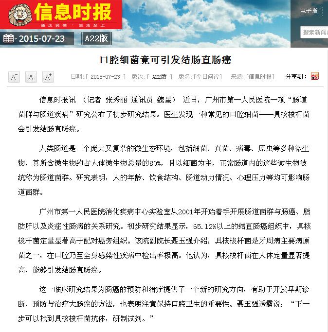 《信息时报》:口腔细菌竟可引发结肠直肠癌 2015年7月23日A22版