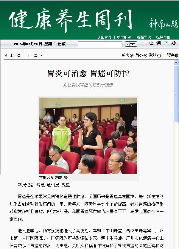 《健康养生周刊》:胃炎可治愈 胃癌可防控 2015年7月28日A01版